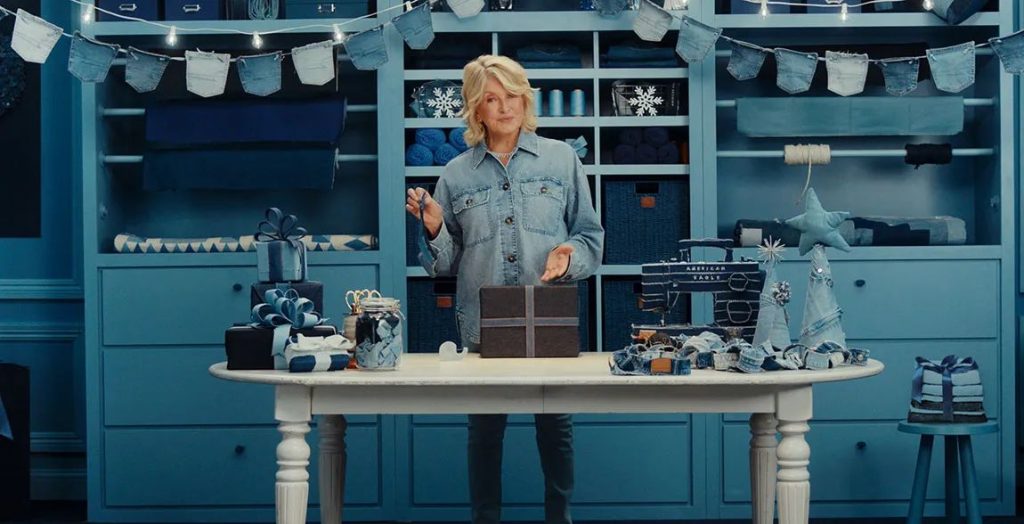 The holiday campaign content features the domestic icon, clad in denim and diamonds, in a blue-denim kitchen with a denim turkey in a roasting pan. The playful and creative twist for the first spot is titled, “Martha Wraps The Gifts in American Eagle”.