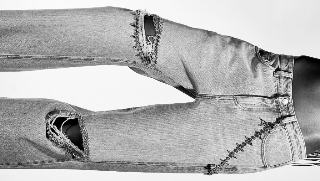 Their denim line is part of the brand’s high-glamour DNA. Embellished, fashion-forward rather than everyday basics. For example, crystal-trimmed jeans, slit details, wide leg or straight leg with dramatic details. And because they are statement pieces, they might be less “versatile everyday” and more “wow piece for an event/outfit”.