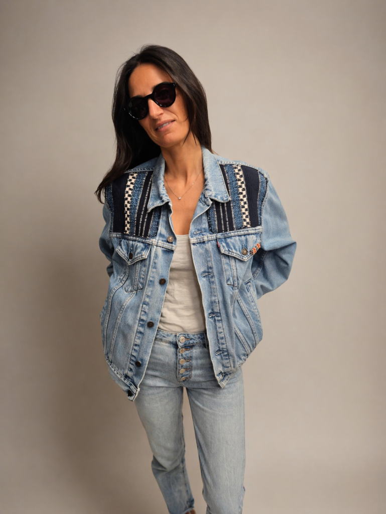 About the re-worked denim trucker, the Sinai Jacket: It features statement back panel details and hand-woven textile inserts