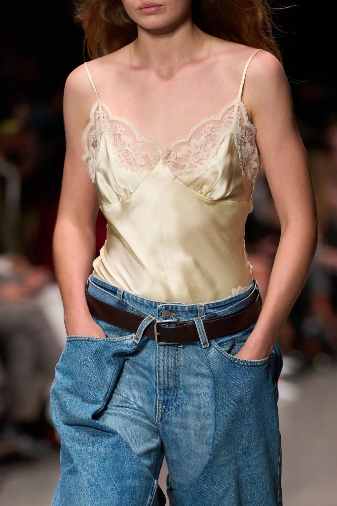 In her Spring 2026 collection, denim is shown in deconstructed and reimagined silhouettes. There are slouchy jeans, layered denim outfits, and pieces with curved paneling (some suggesting a jacket tied around the waist).